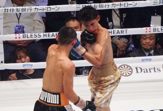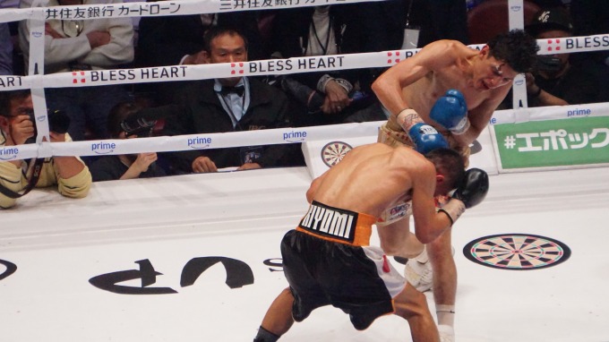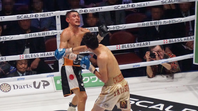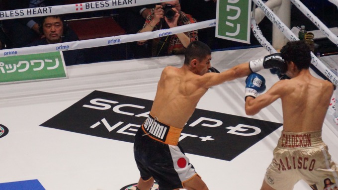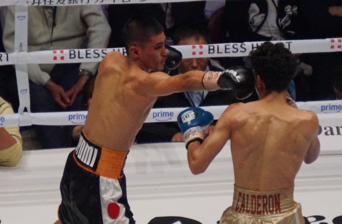 カルデロンは秋次の回転力に反応が遅れ気味で、身体を折り曲げてボディをもらうなど面食らっている様子がうかがえた。