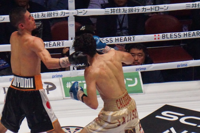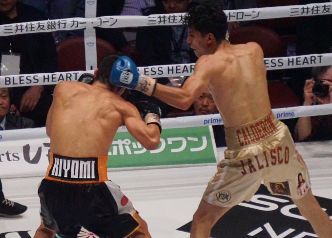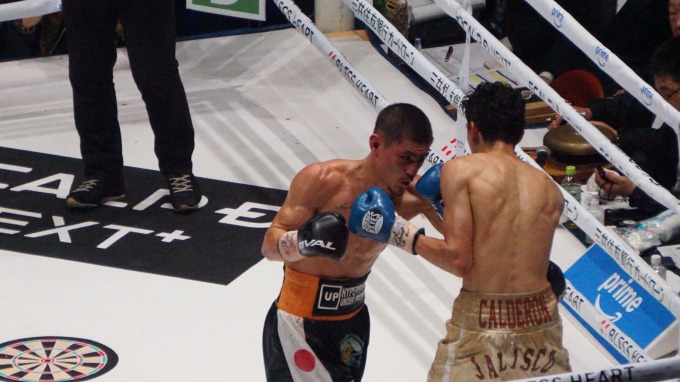 前回の増田戦では自分から前に出て連打を浴びせていたカルデロンだが、これだけ入ってこられると対処が難しい。