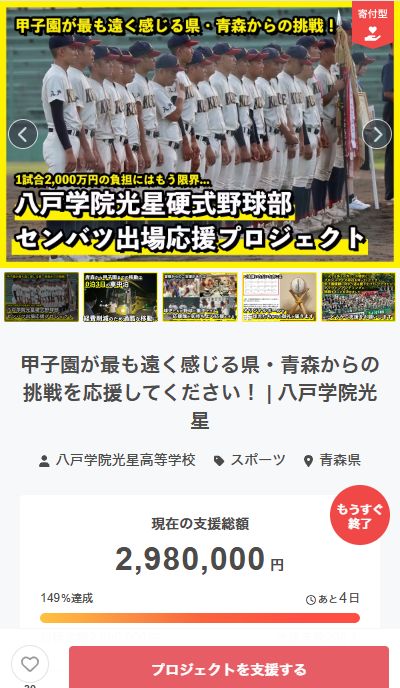 なお記事によると八戸学院光星の目標金額は200万円。3月26日時点で達成済みとのこと。