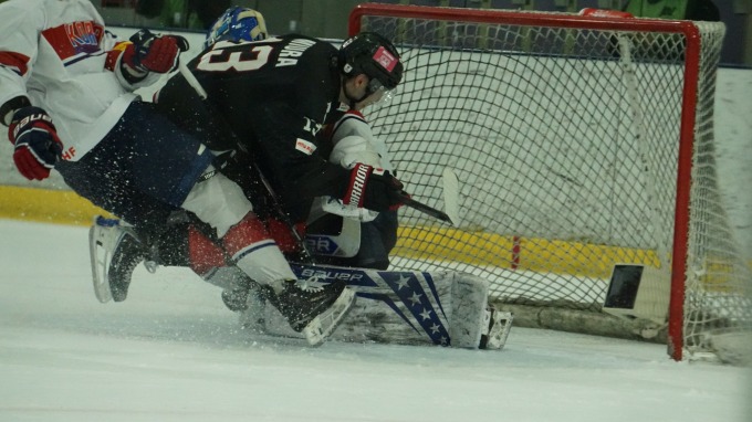 平野が自らパックを奪いにいく、ハードワークせざるを得ない状況では勝つのは難しい。