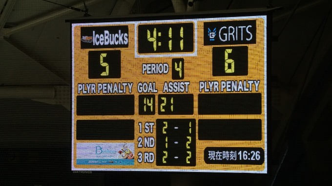 3Pの終了間際にアイスバックスが5点目を入れて1点リード→これで決まりかと思われた残り1分半からグリッツが6人攻撃で同点に追いつく!!