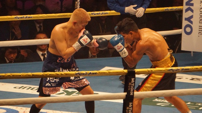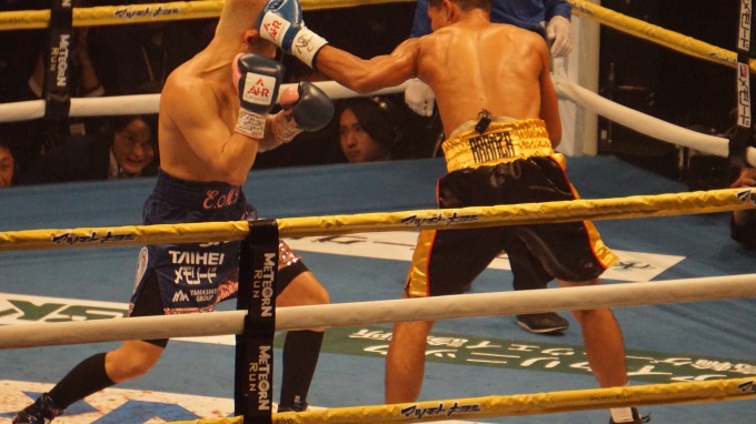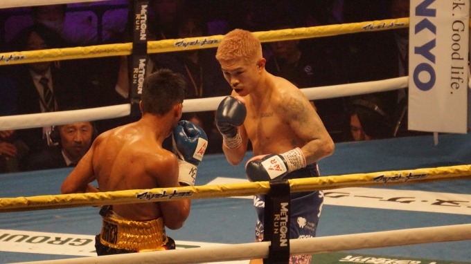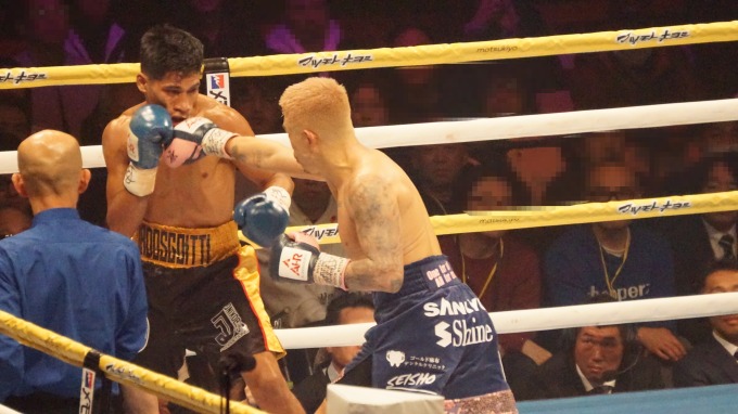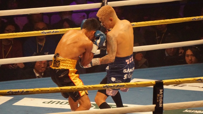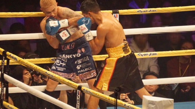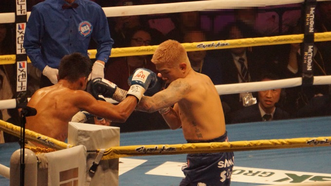 一方の井岡は逃げ場を塞ぎながら距離を詰め、得意の接近戦で圧倒。細かい出入りを駆使して力感のないパンチを上下に散らす。