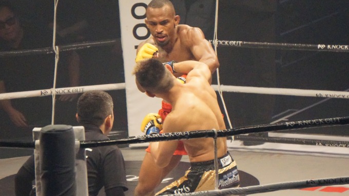 タックルを警戒する? せいでプンルアンはなかなか肘の距離に入れない。