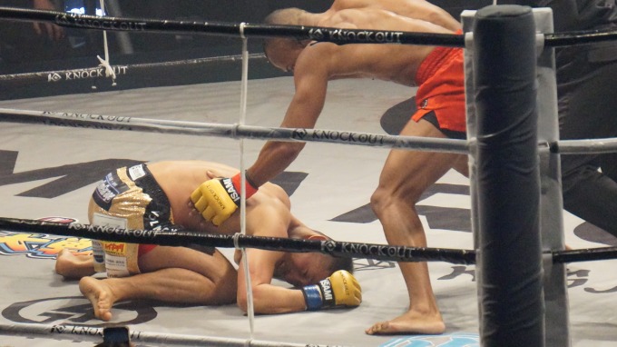 遠間で何回か蹴りを放ったものの、すぐにキャッチされて倒されてしまう。